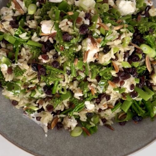 - In a large salad bowl, combine the brown rice, broccolini, currants, spring onions, and toasted slivered almonds. Crumble the goat cheese or feta over the salad.
