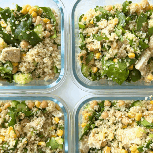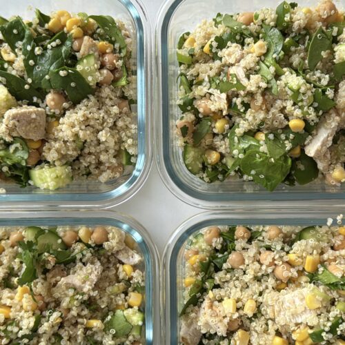 - In a large bowl, combine the spinach, quinoa, corn, chickpeas, cucumber, capsicum, spring onion, parsley, and chicken.