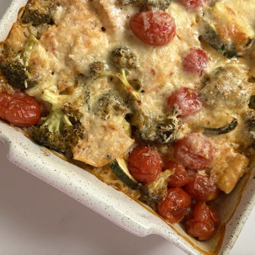 - In a large ovenproof baking dish, add the rice, chopped chicken, broccoli, zucchini, and cherry tomatoes, pesto and chicken stock, mix till well combined.