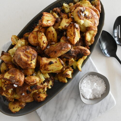 - Tip the potatoes onto a large baking tray. Add the garlic cloves, plenty of salt and pepper and a drizzle of extra virgin olive oil. Toss to coat.6 garlic cloves, Salt and pepper, Extra virgin olive oil