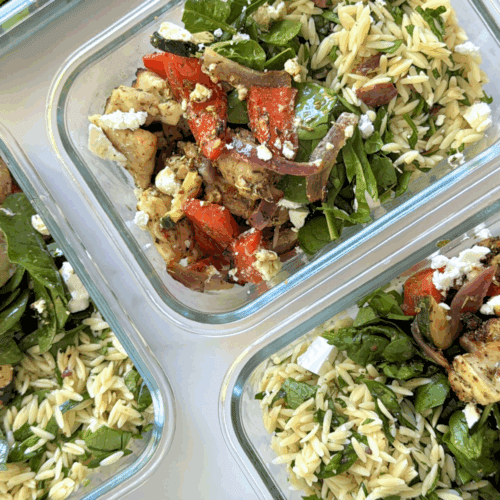 - Reheat chicken, vegetables, and risoni in the microwave before serving, then top with tzatziki and a squeeze of lemon.