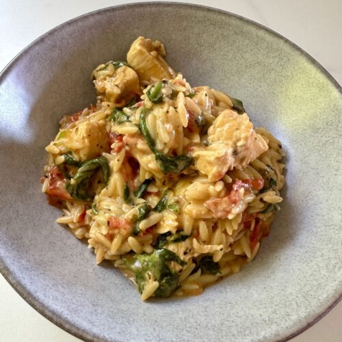 - Add the butter and the remaining olive oil to the same pan and reduce the heat to medium. Add the onion and sauté for 2–3 minutes until starting to soften. Add the garlic and sun-dried tomatoes with a drizzle of their oil and cook for another 1 minute until fragrant. Stir in the zucchini and cook for 2 minutes, then add the risoni and stir through for 1–2 minutes. Pour in the stock and cream, stir to combine and bring to a simmer.1 tablespoon unsalted butter, 1 onion, 3 garlic cloves, 1/2 cup sun-dried tomatoes in oil, 1 zucchini, 1 cup risoni, 2 cups chicken stock, 3/4 cup thickened cream