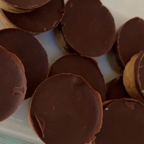 - Spoon the melted chocolate over each peanut butter base until the tops are covered.