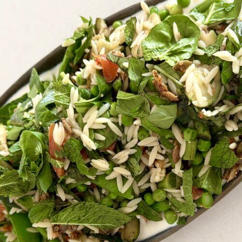 - Plate up! Combine the spinach, risoni, blanched vegetables, basil, mint and sun-dried tomatoes in a large serving bowl. Toss gently to mix. Drizzle on the dressing and gently toss again to coat evenly. Just before serving, sprinkle with the toasted parmesan pumpkin seeds for added crunch.2 cups risoni, 1 bunch basil, 1 large handful mint leaves, 100 g sun-dried tomatoes, 2 cups baby spinach leaves