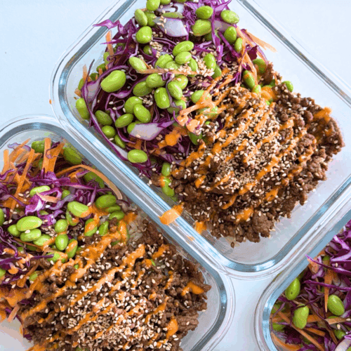 - Divide the cooked rice between 4 meal prep containers. Top each with the teriyaki beef, and then the cabbage mix.