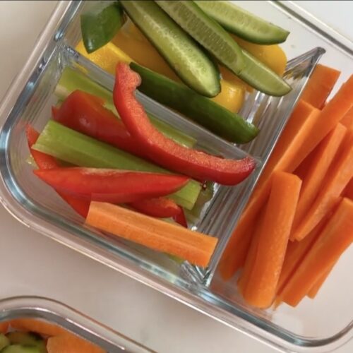 - Slice capsicums into thin strips, cut carrots and celery into sticks, and slice cucumbers into batons.