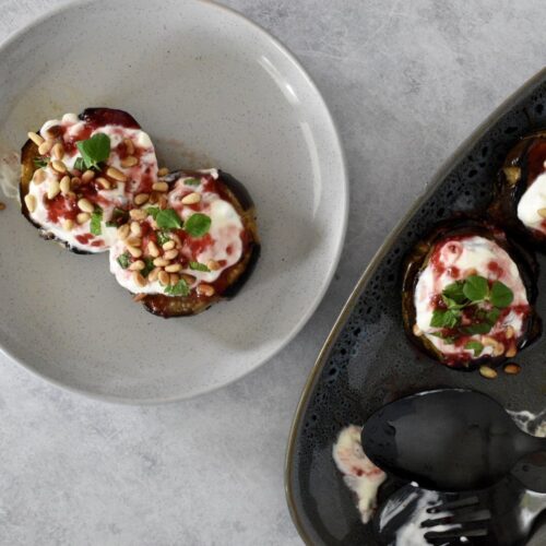 To serve, top each eggplant round with a good dollop of the yoghurt sauce. Garnish with mint, toasted pine nuts and a drizzle of raspberry vinegar or sprinkling of pomegranate seeds. Serve immediately (the pomegranate or raspberry vinegar will get runny and messy if you wait).